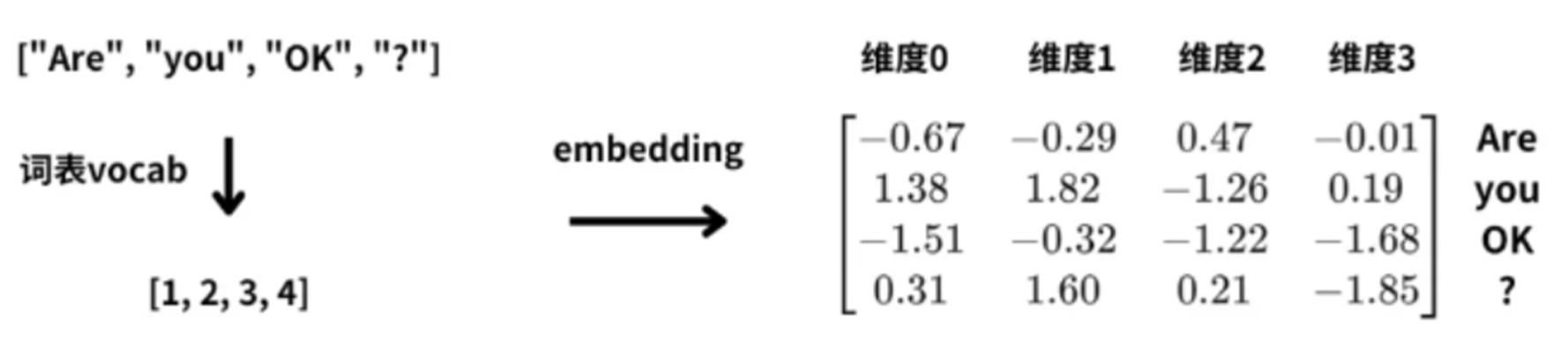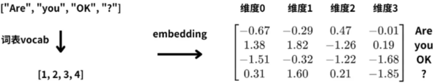 这里每个单词用4维向量表示,那么四个词的句子“Are you OK ?”,就会被转换为4 * 4的词向量矩阵;