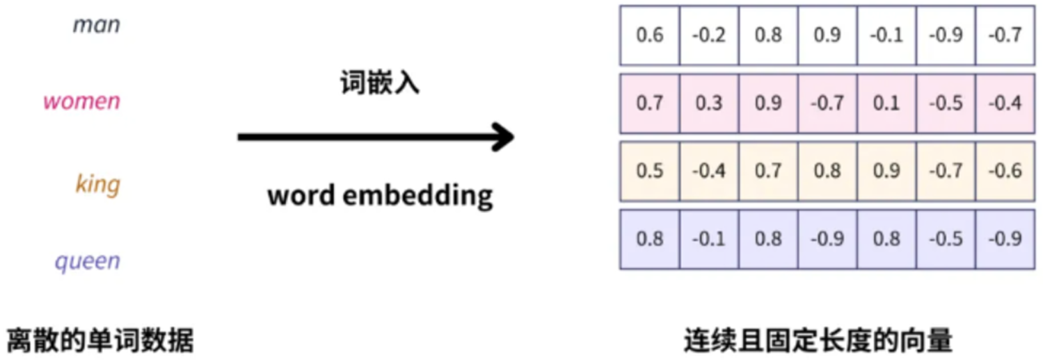 词向量(词嵌入)是一种将词汇表中的词或短语,映射为固定长度向量的技术。通过词嵌入,我们可以将高维且稀疏的单词索引,转为低维且连续的向量。将非结构化数据,如单词、句子或者整个文档,转化为实数向量。