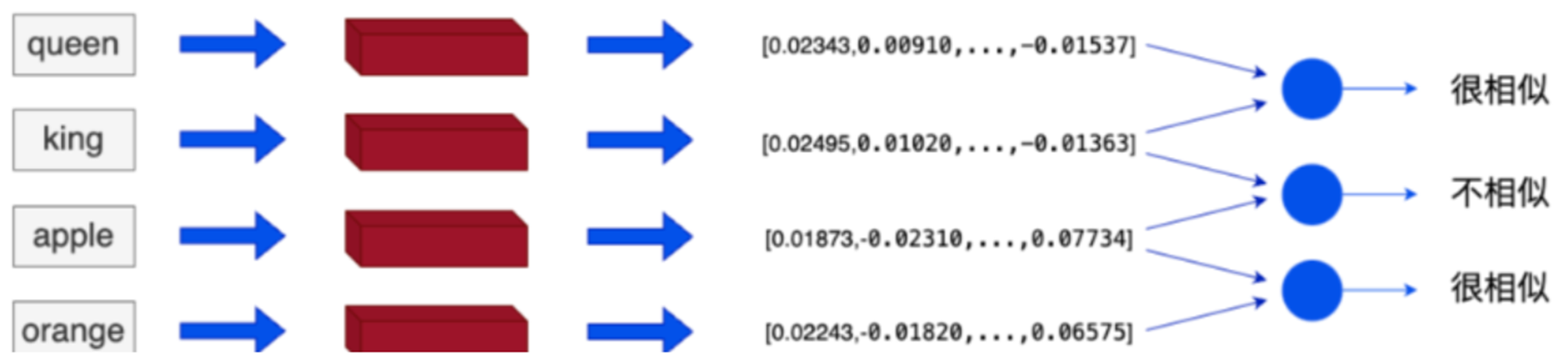king和queen在嵌入空间中的位置将会非常近,因为它们的含义相似。而 apple和 orange也会很接近,因为它们都是水果。而king和apple这两个单词在嵌入空间中的距离就会比较远,因为它们的含义不同。