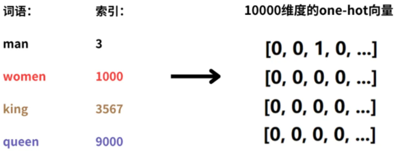 词汇表中有10000个单词,表示man、woman、king、queen四个词语,这四个词语的索引是1~10000中的4个整数。如果用one-hot向量表示这4个词;那么就需要4个10000维度的one-hot向量。不仅维度高,而且稀疏。在向量中,只有1个维度是1,其他维度都是0。单词向量和单词向量之间,都是正交的(正交:两个向量的点积(内积)为零;几何学中,如果两条线或两个平面相交且形成的角是直角),没有任何语义关系。