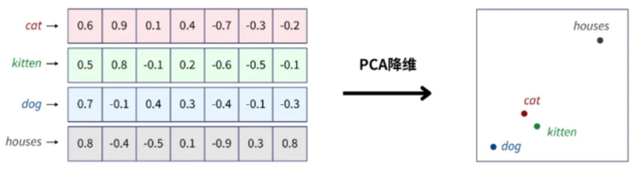 - 转换后的连续向量,可以表示出单词与单词之间的语义关系。