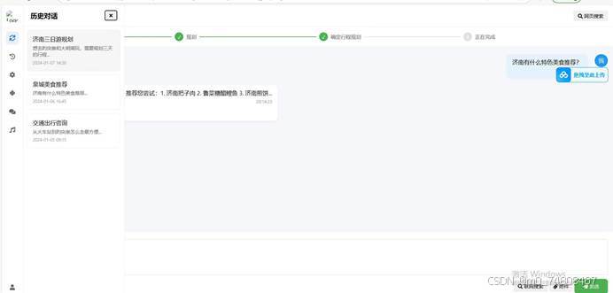 为方便用户回顾之前的旅行规划咨询,我们成功实现可查看历史会话、保存之前对话内容的功能。