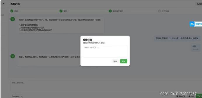 在用户得到旅行规划推荐结果后,前端界面弹出简洁明了的反馈窗口,用户可根据输出给出多维度改进意见,反馈内容涵盖推荐景点是否符合需求、行程安排是否合理、信息详细程度是否足够等方面。同时,利用 Java 开发专门的后台数据处理系统,该系统运用大数据分析技术,能够对用户反馈的信息进行实时收集、分类和分析。例如,采用文本分类算法对用户反馈进行自动分类,将关于景点推荐的反馈、行程规划的反馈等分别归类。团队成员定期通过数据可视化工具查看用户反馈数据,从中提取有价值信息。一旦发现用户普遍反映某个区域美食推荐较少,迅速组织相关人员,调整推荐算法,增加该区域美食相关权重。通过建立这一反馈机制,我们能够与用户建立良好互动,及时了解用户需求,不断改进产品,有效提升用户满意度。