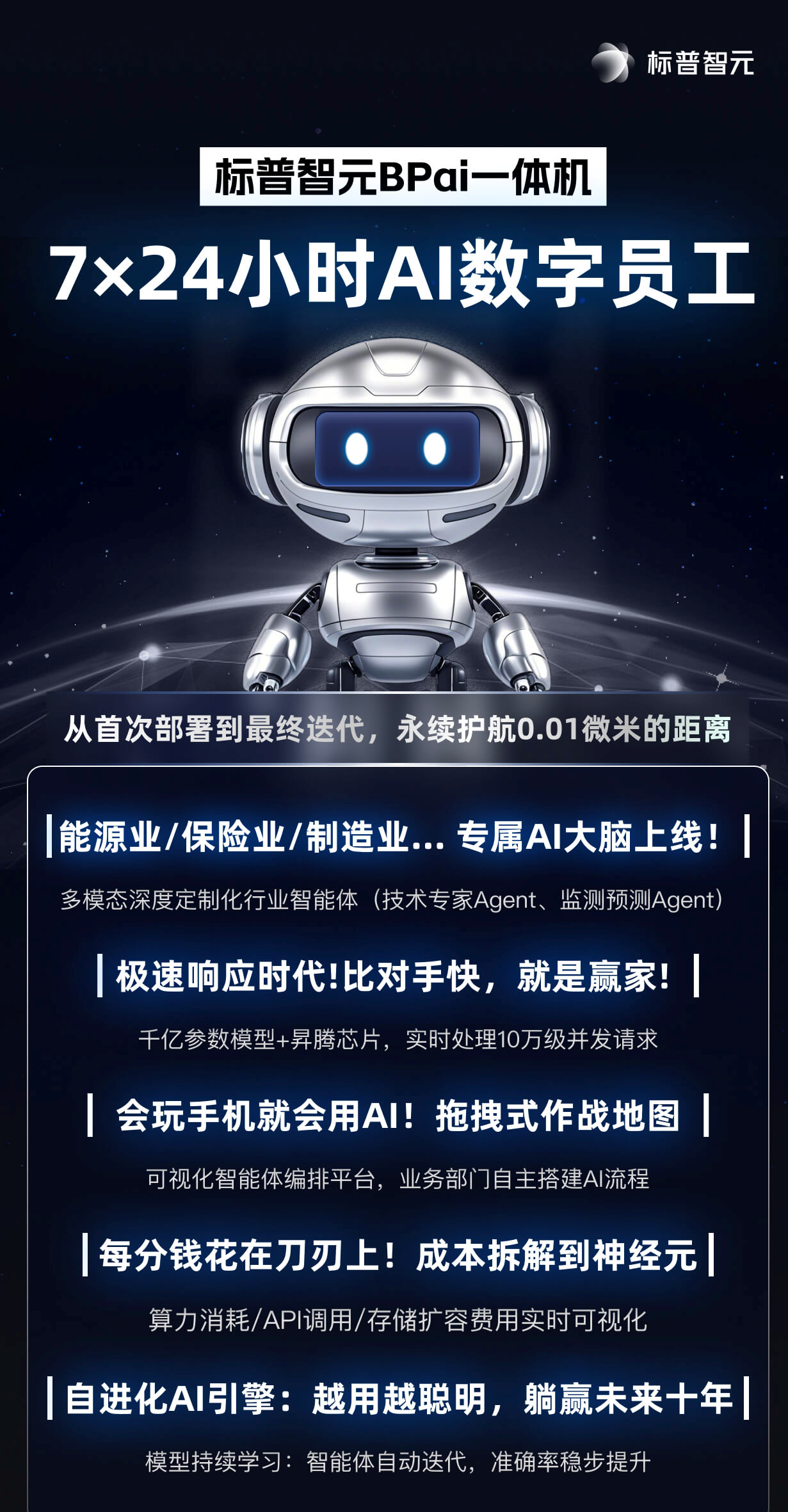 当你在呼交AI时,另一个企业已经把它做成了 "数字员工",不仅能按需解答,还能24小时在线处理业务请求。【标普智元 BPai 一体机】,托管时代自主研发的 AI 数字员工完整体系,将 LLM + Agent 智能体组织到业务中,应用在能源、保险、制造、政务等多个行业场景。