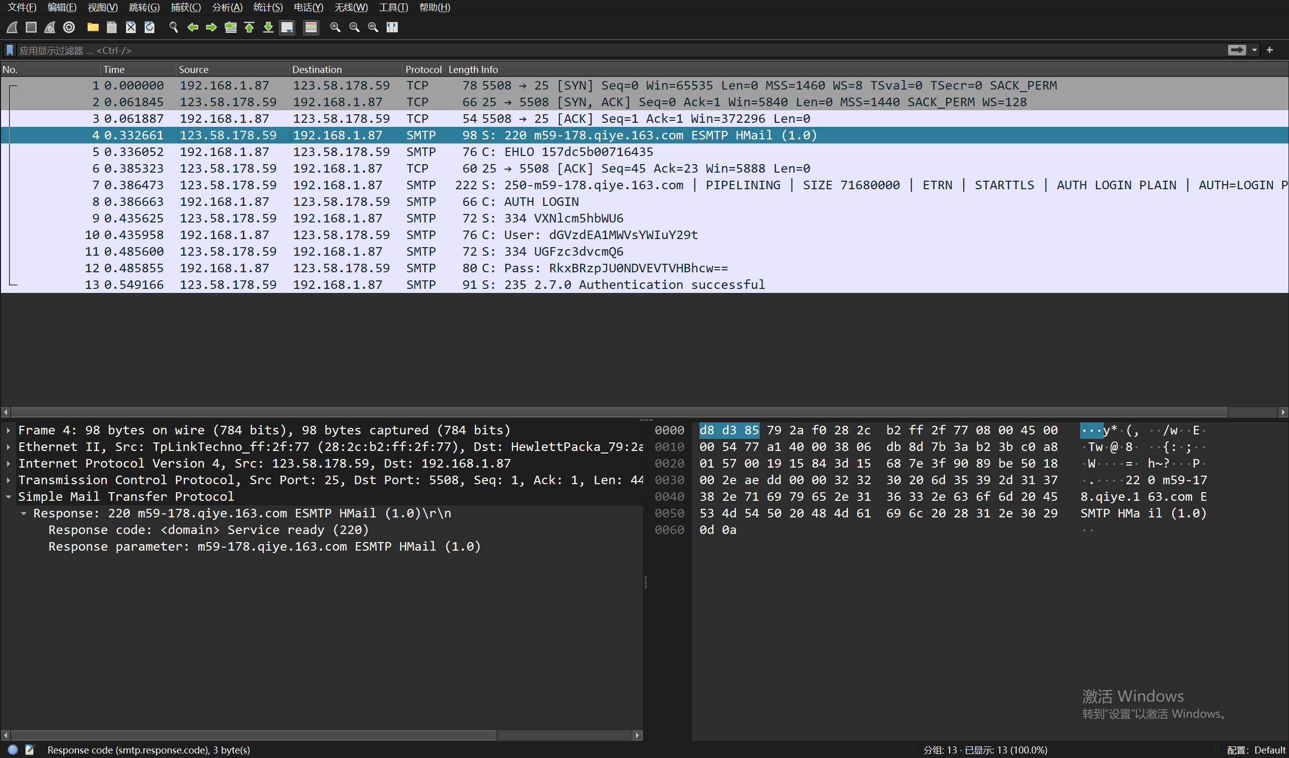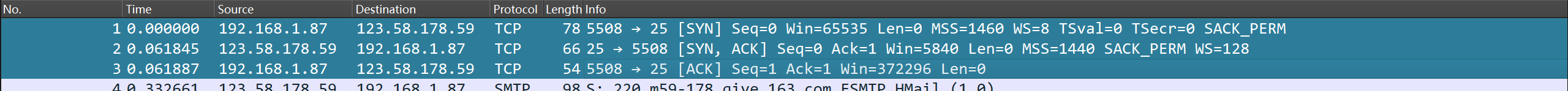 这个包是一个 SMTP 协议初始化响应,表示邮件客户端正在与网易企业邮件服务器建立连接,服务器回应了状态码 220,表明连接已经成功建立,接下来可以进行进一步的邮件传输操作。