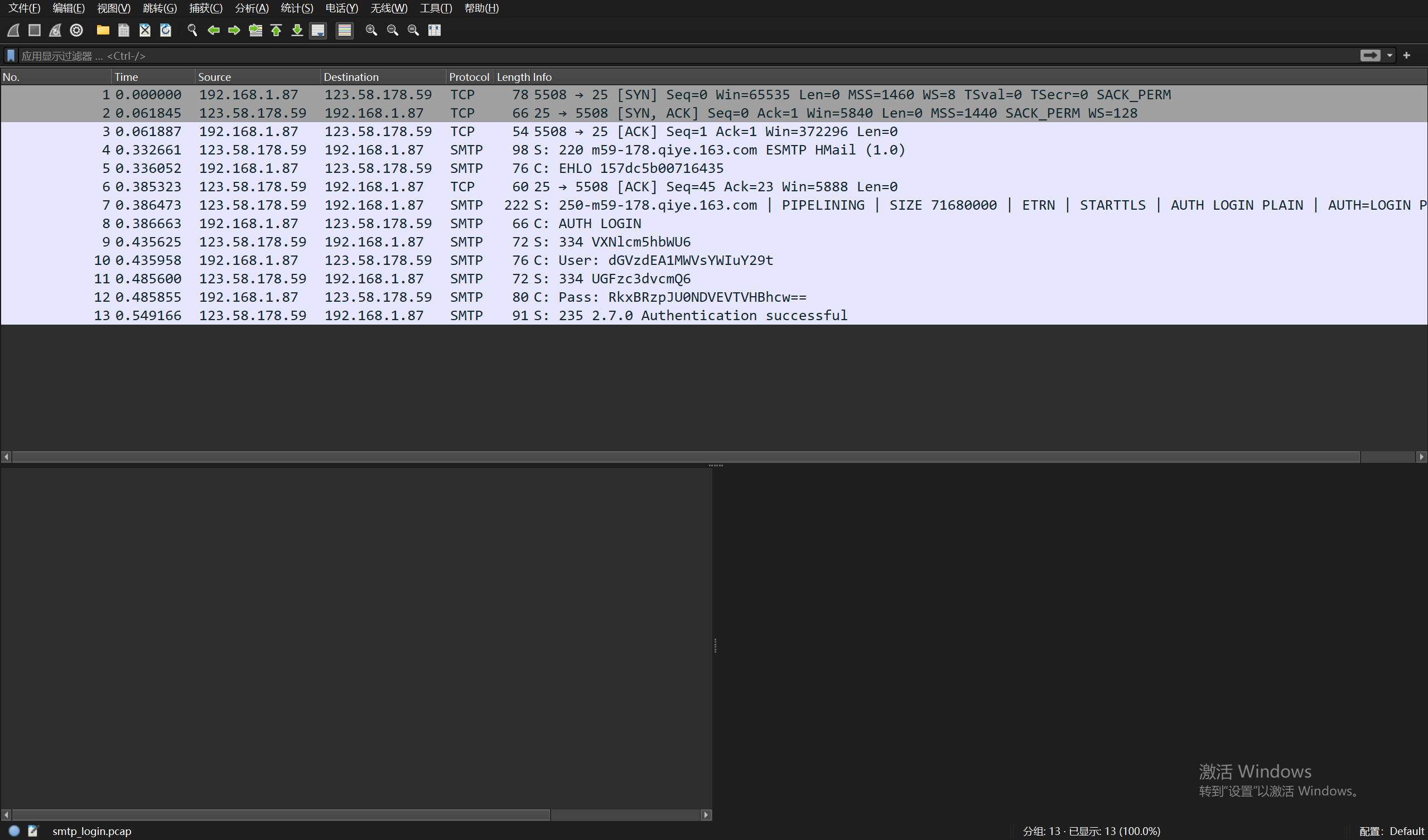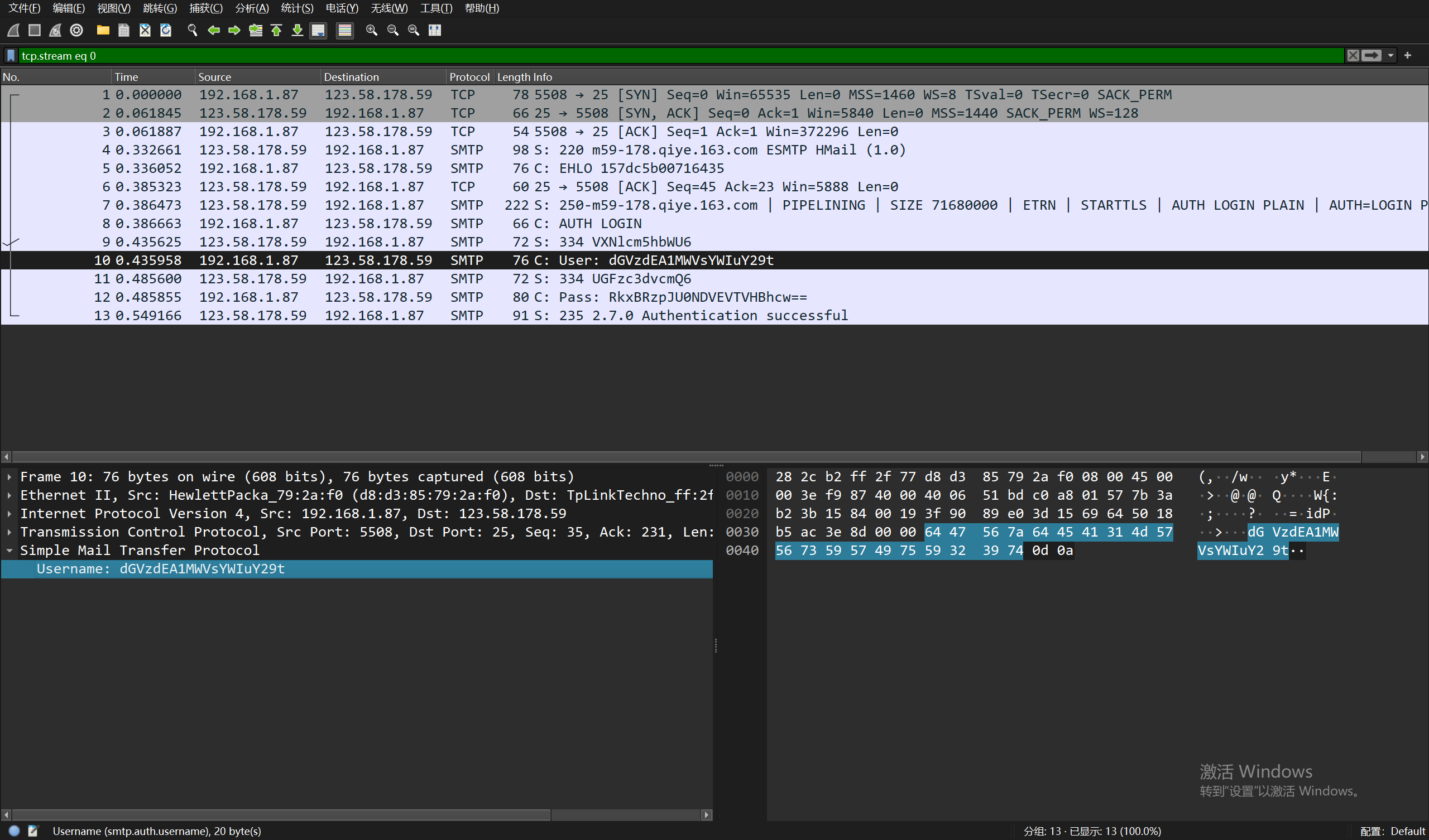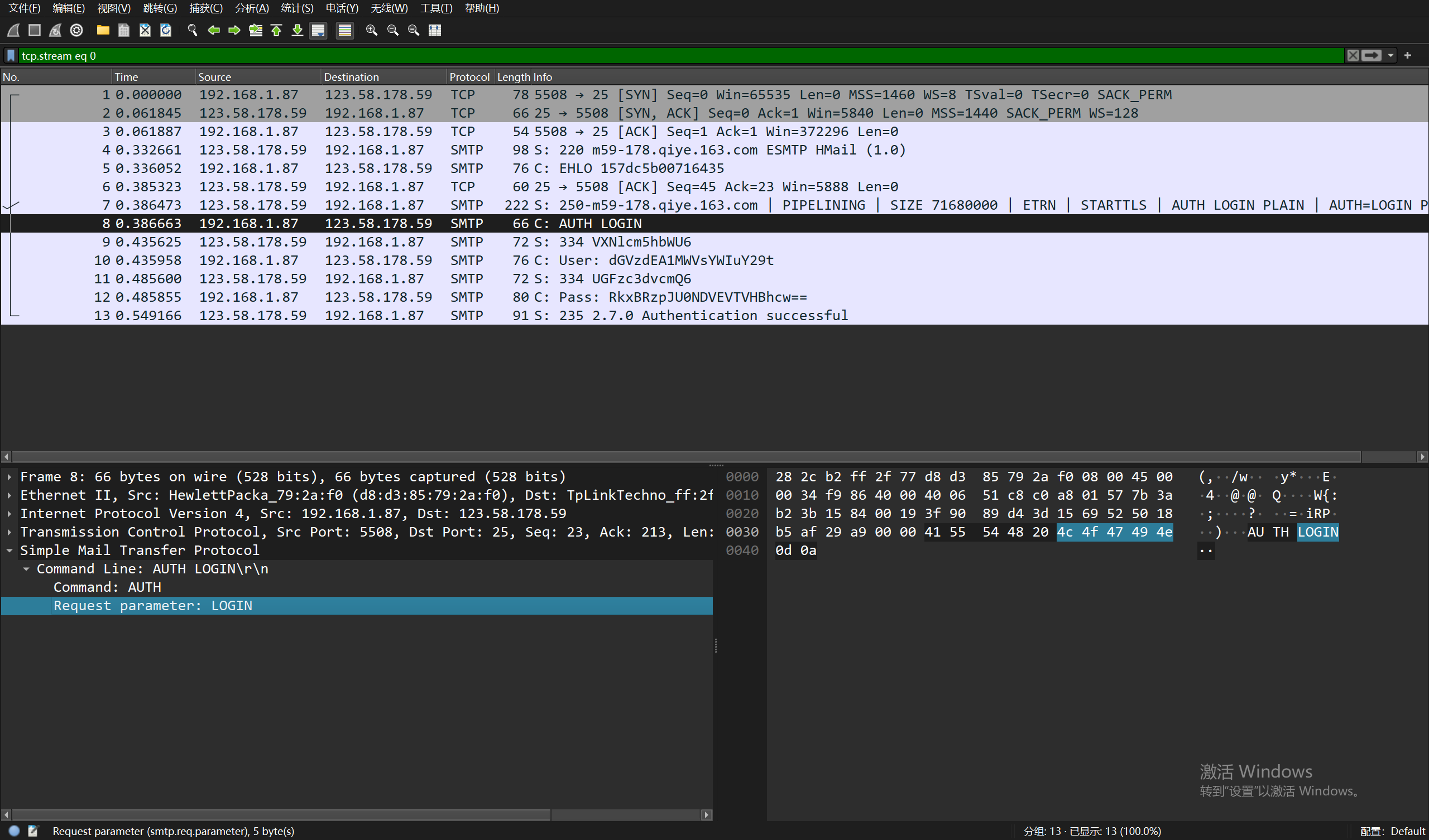 第8个数据包标志着 SMTP 客户端和服务器之间身份验证的开始,客户端通过 AUTH LOGIN 命令向服务器请求进行用户名/密码验证。