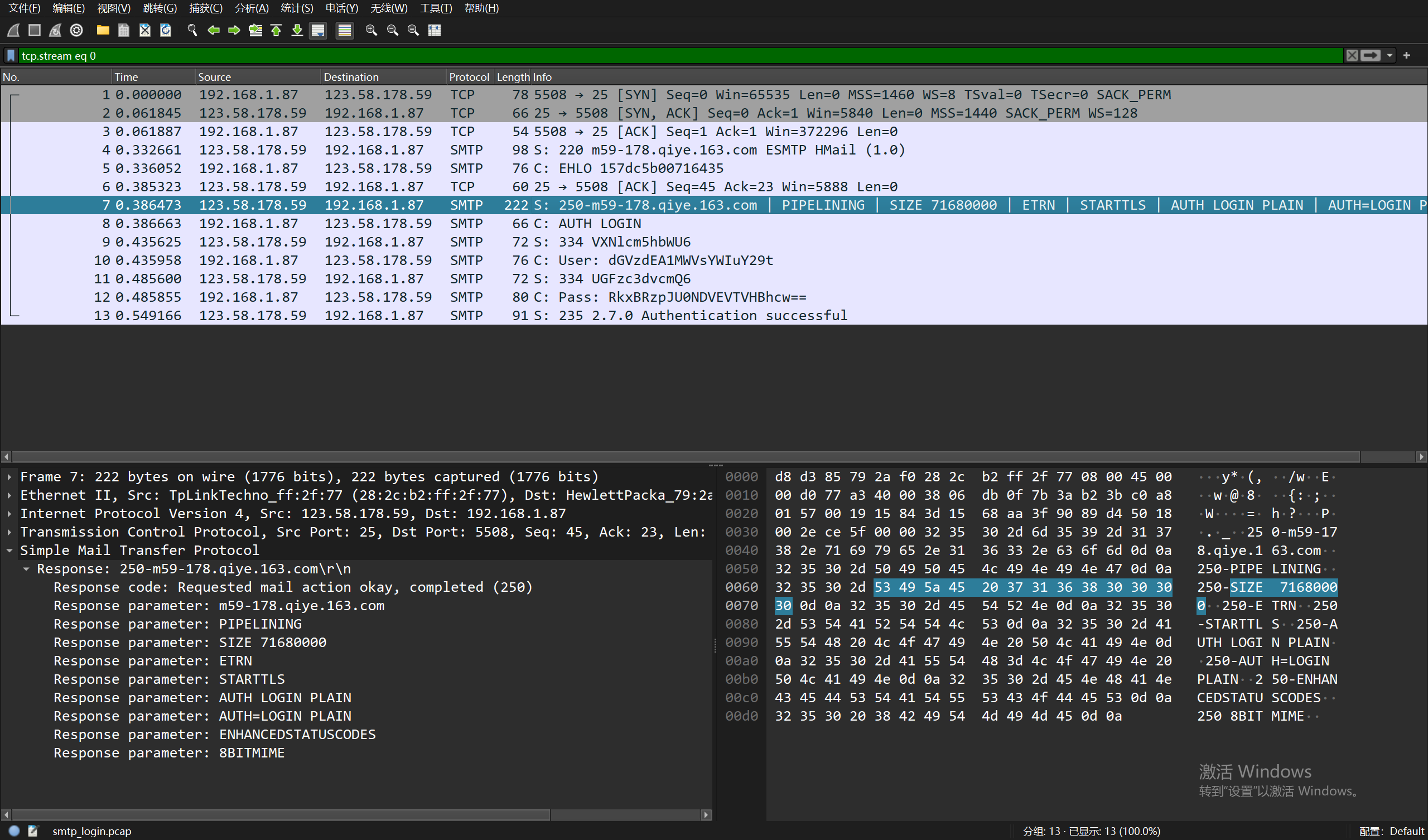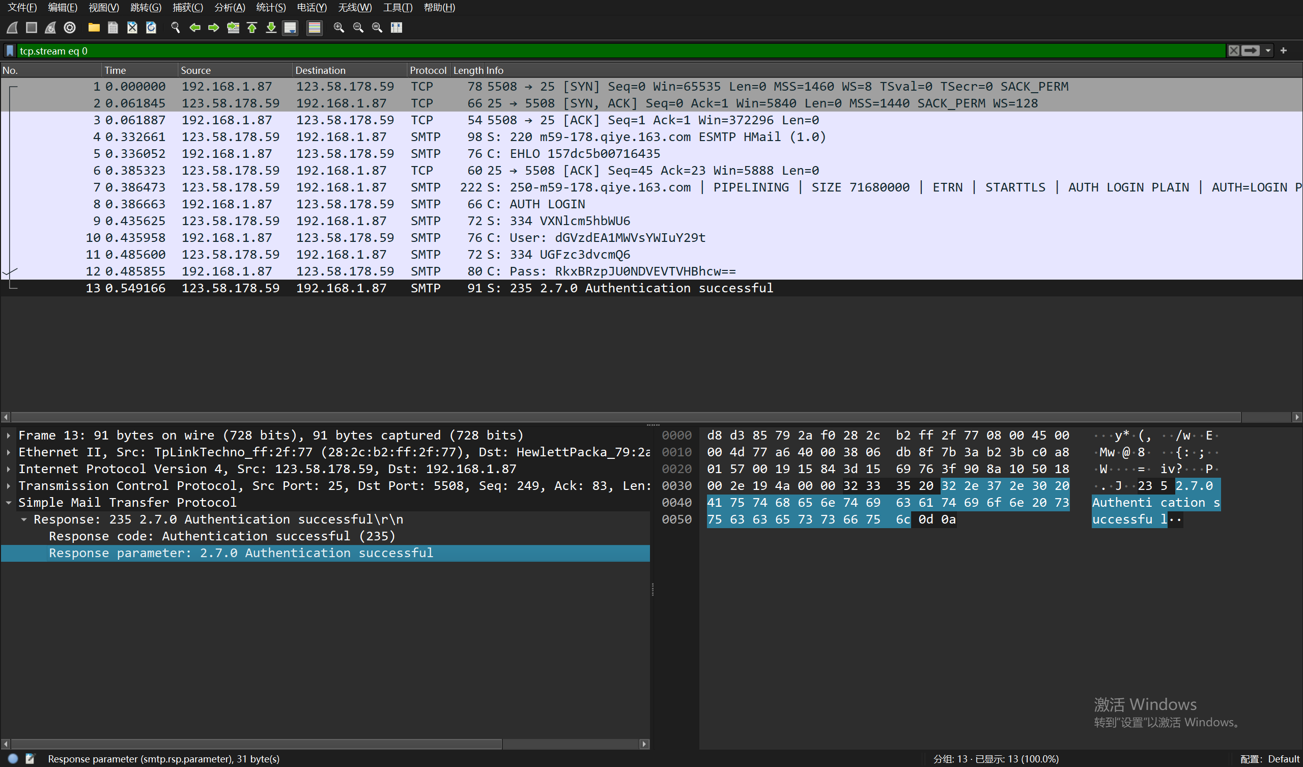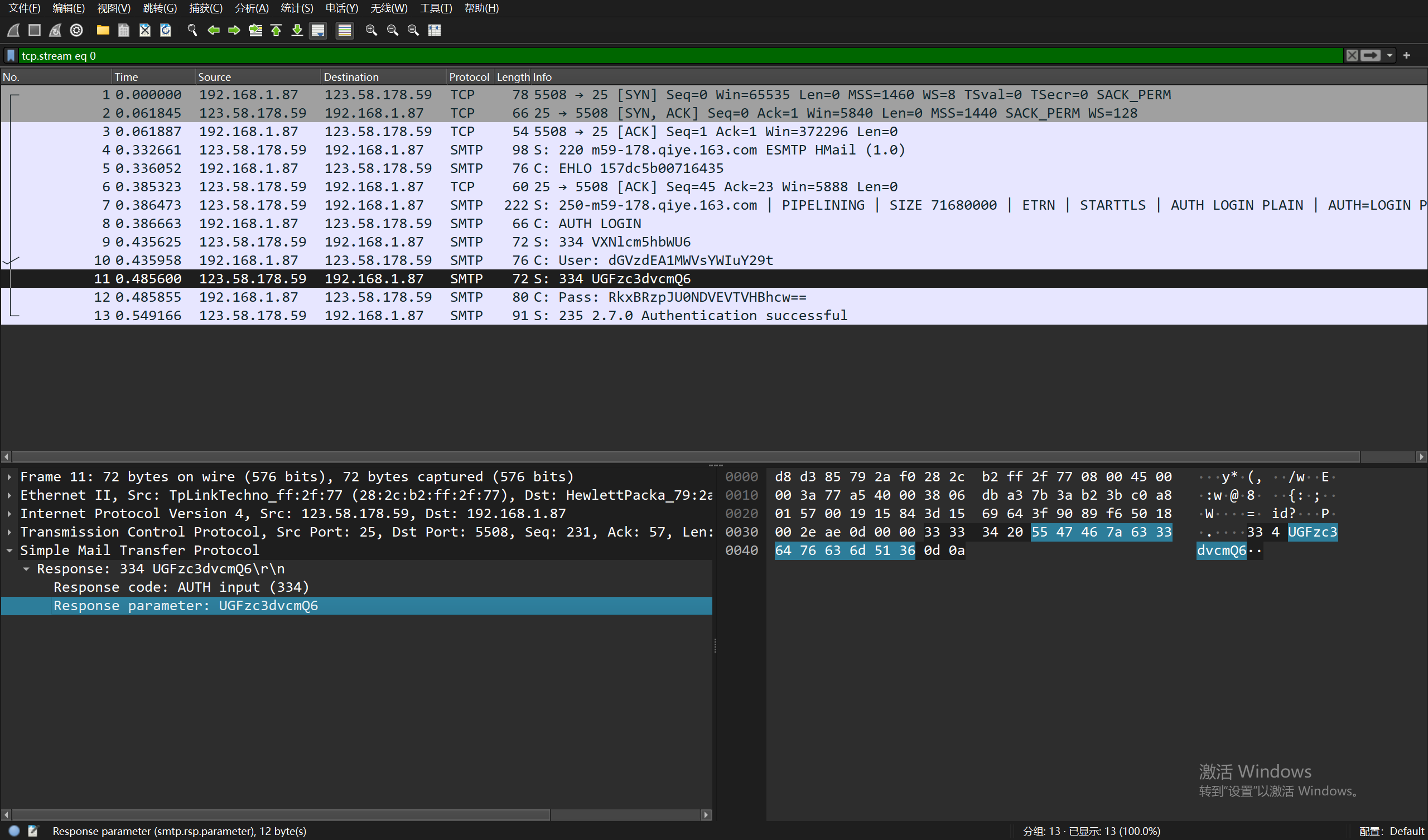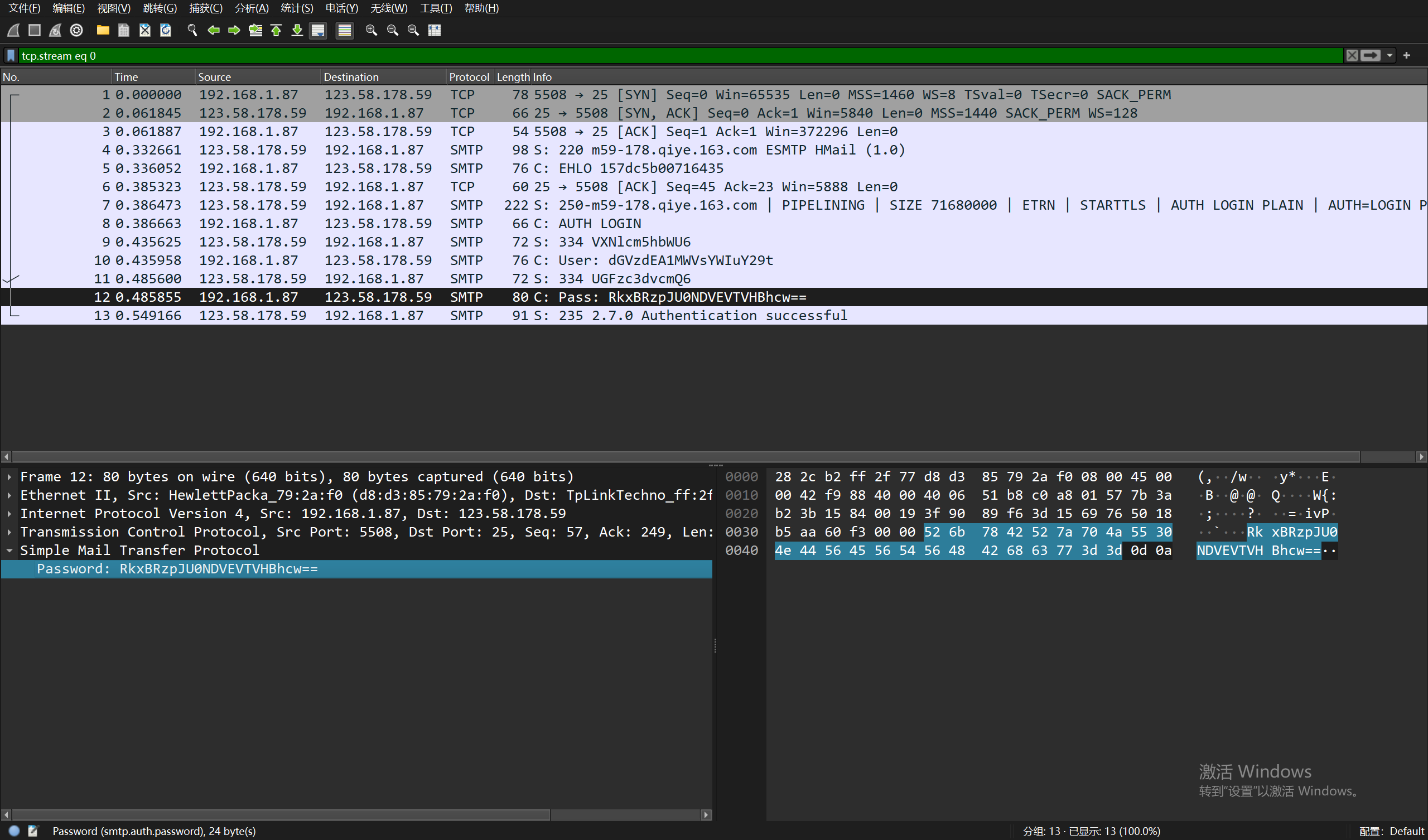 第8个数据包标志着 SMTP 客户端和服务器之间身份验证的开始,客户端通过 AUTH LOGIN 命令向服务器请求进行用户名/密码验证。