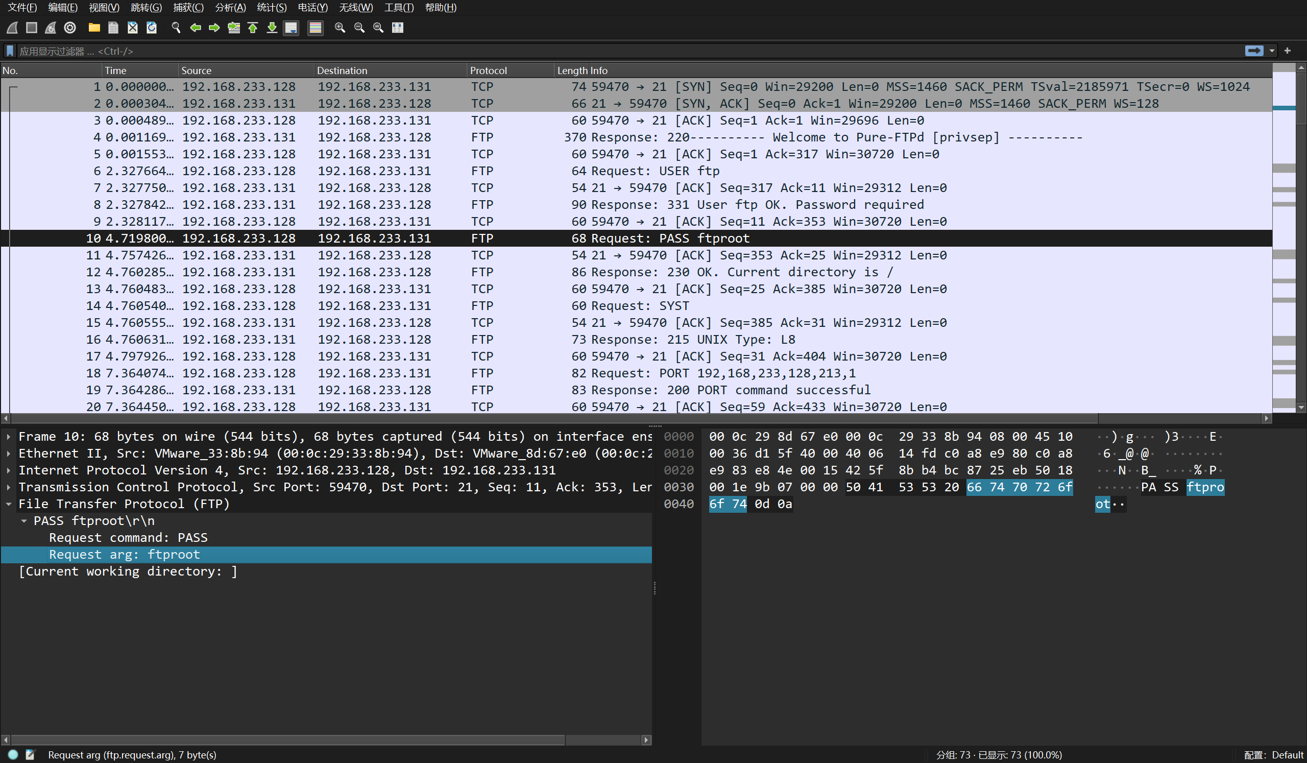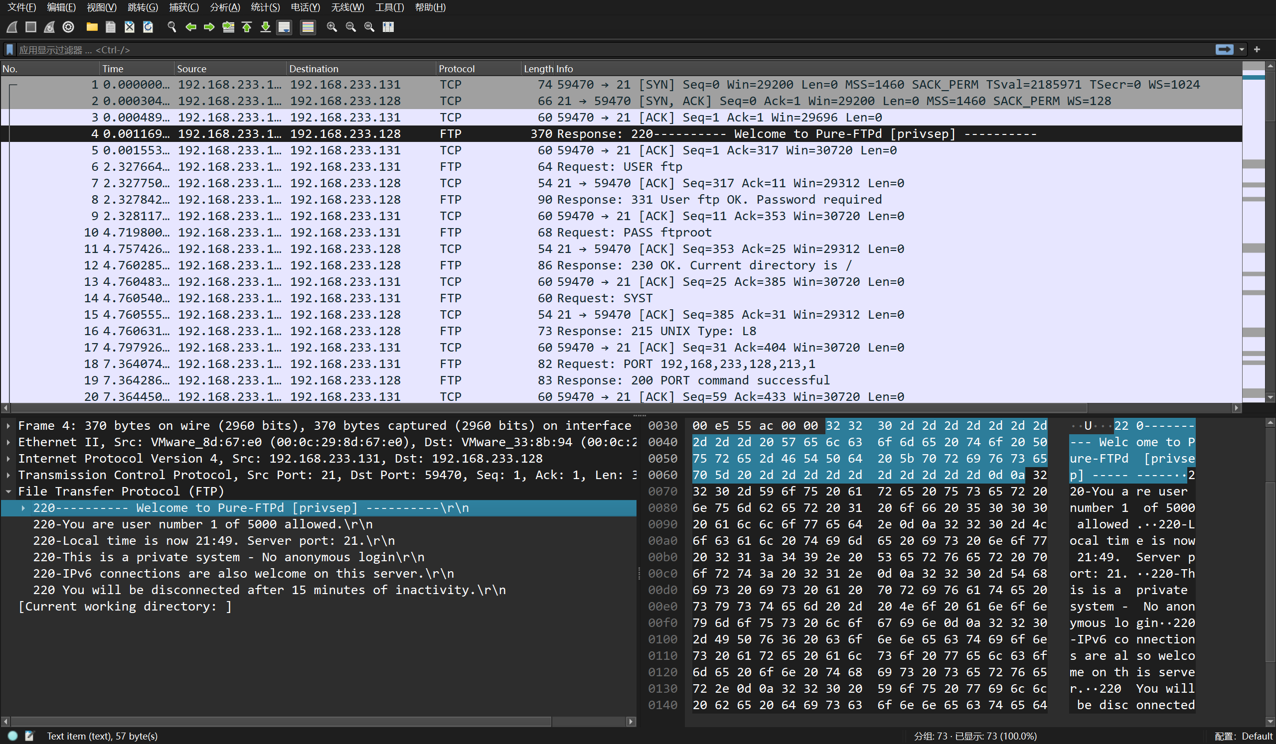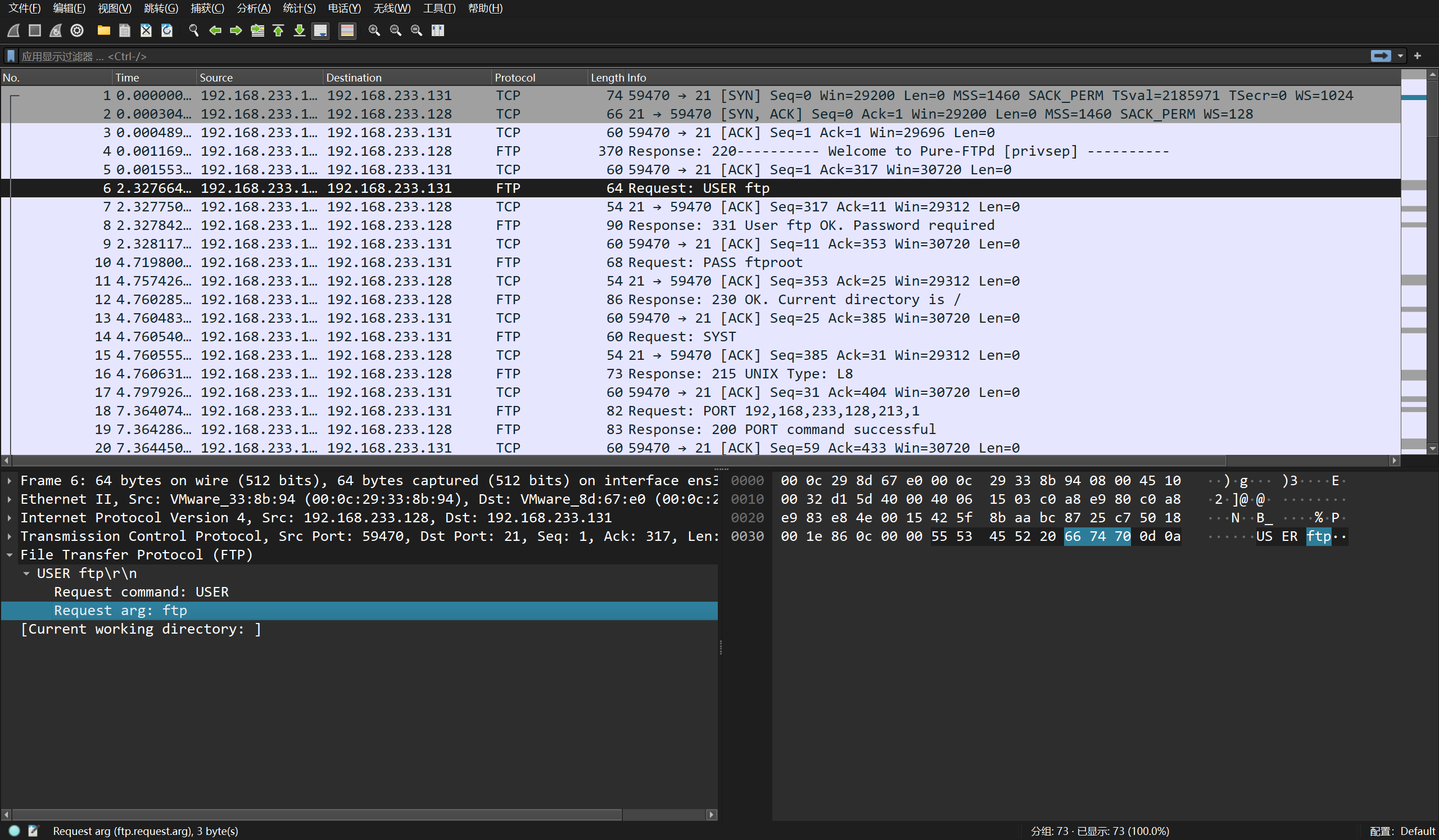 客户端发送USER 用户名,服务器返回331状态码,要求用户传送密码,PASS 密码,最后服务器返回230状态码登录成功