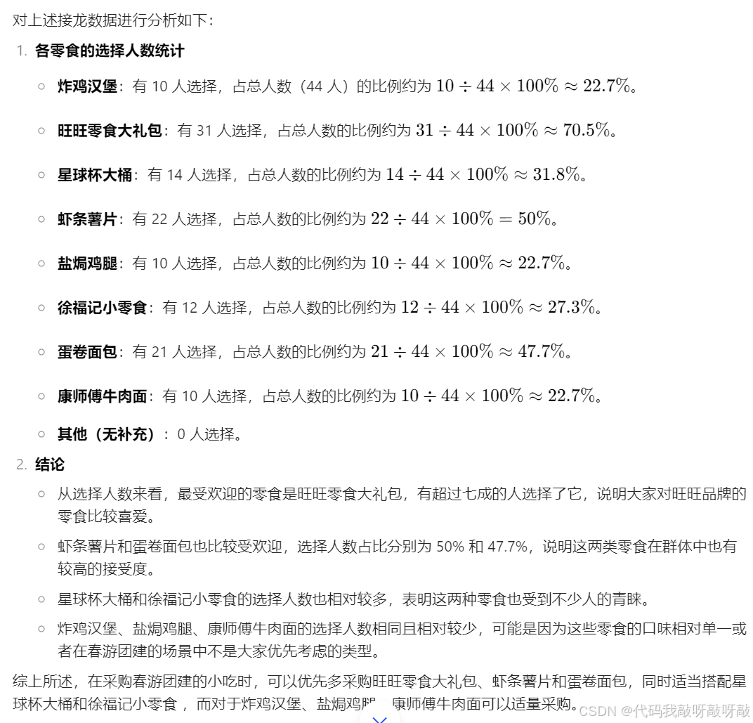 假设你是你们班的班长,或者你是社团的主要负责人,现在组织团建,大家伙一起出去玩,但是于是你发起了微信群的统计,最后根据统计回来的结果,来决定团建应该买些啥吃的。一份统计好的食材清单及数量看到这个案例,我已经打算用传统的方法,来一点一点码字了,直到我遇到了.......AI文本大模型就像是一个超级大脑,它通过学习海量的文字信息(比如书籍、文章、网页内容等),学会了怎么用语言表达各种想法。可以给它一个