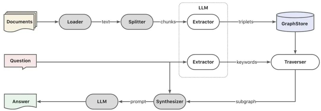 知识加载 -> 知识切片 -> 信息抽取 -> 知识加工(embedding/graph/keywords) -> 知识存储