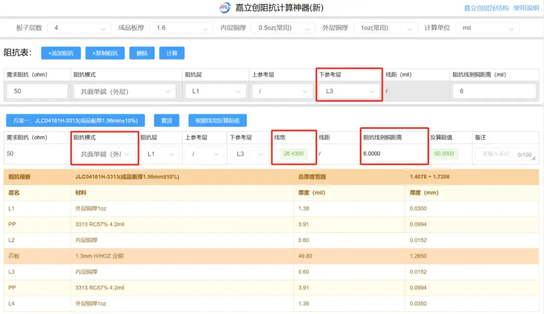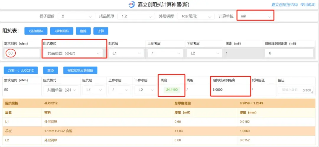 下面是立创阻抗计算器网址,如果有其他线宽和叠构需求,请自行计算;投板的时候请将需要阻抗控制的线段高亮截图给板厂,要求板厂按要求进行微调管控。