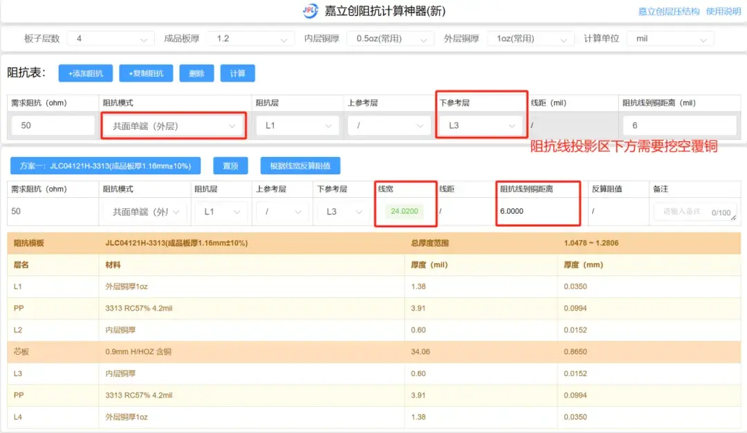 阻抗线到铜箔距离6mil,线宽24.02mil;注意L2层阻抗线下方覆铜挖空处理。