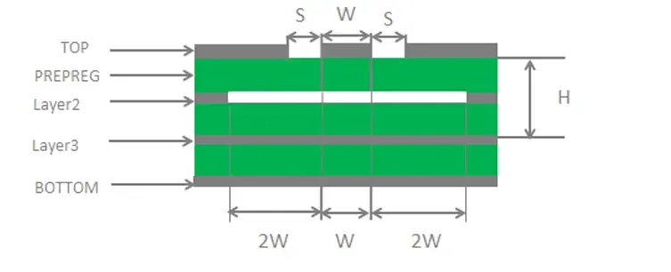 上图需要注意多层板结构参考地和阻抗线之间的层,需要将阻抗线投影区下方挖掉5W线宽的覆铜如上图L2层。