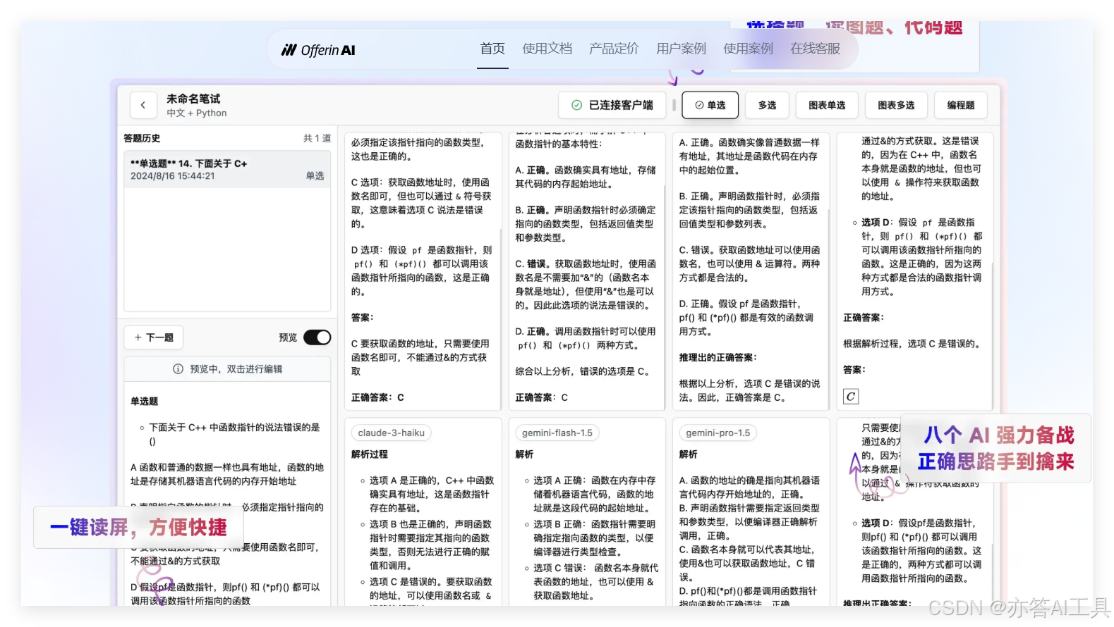除了面试,Offerin AI还支持笔试模式。求职者可以安装Offerin AI客户端,利用远程遥控截图功能,在笔试过程中避免平台检测。同时,Offerin AI的AI助手提供八个辅助工具,帮助用户破解笔试题。