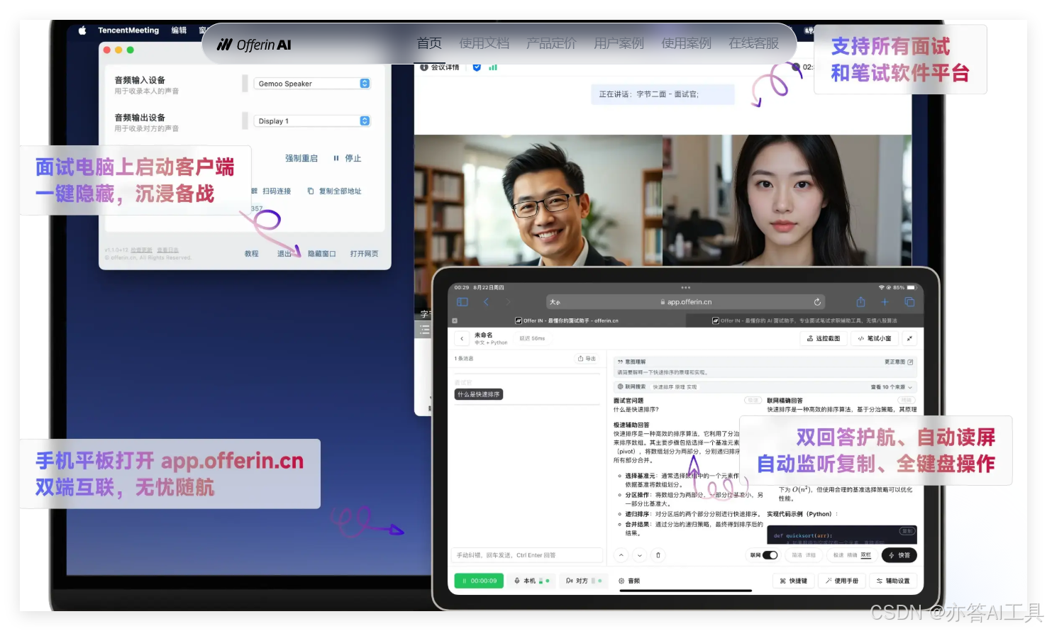 Offerin AI特别注重隐蔽性,在音频来源的选择上,用户可以设置不同的隐蔽模式,确保在电话或AI面试中保持隐私。此外,还支持选择手机和电脑双机互联,提供最强的隐蔽性,适用于各种在线面试场景。