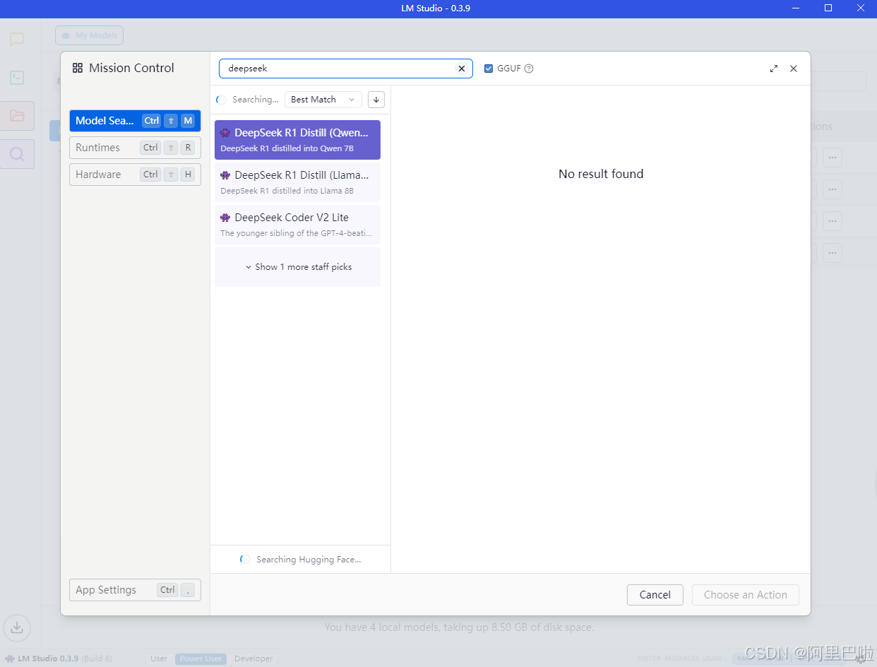 LM Studio 支持加载 Hugging Face 上的模型。你需要下载 DeepSeek 模型的权重文件(通常是 .gguf格式):